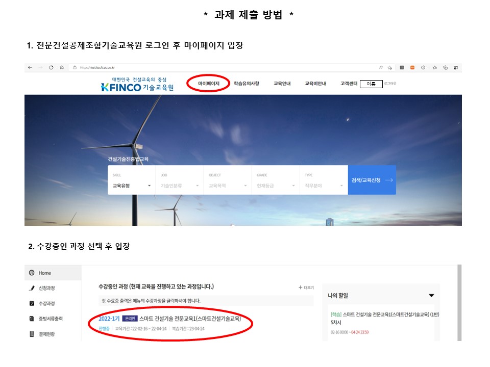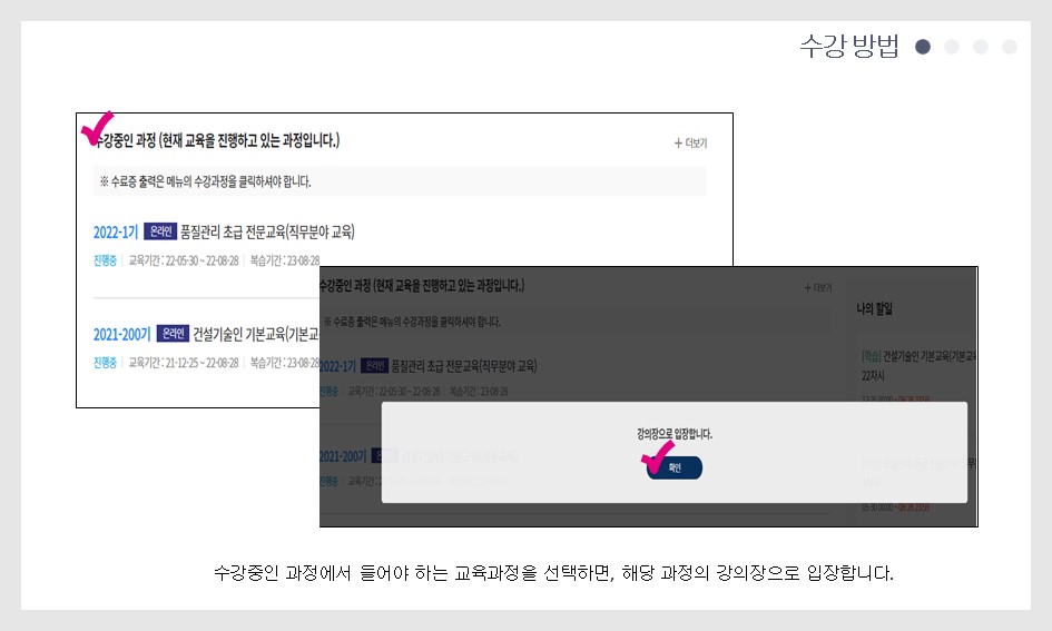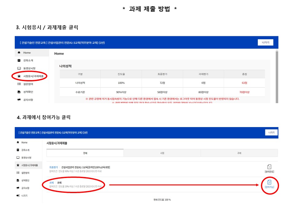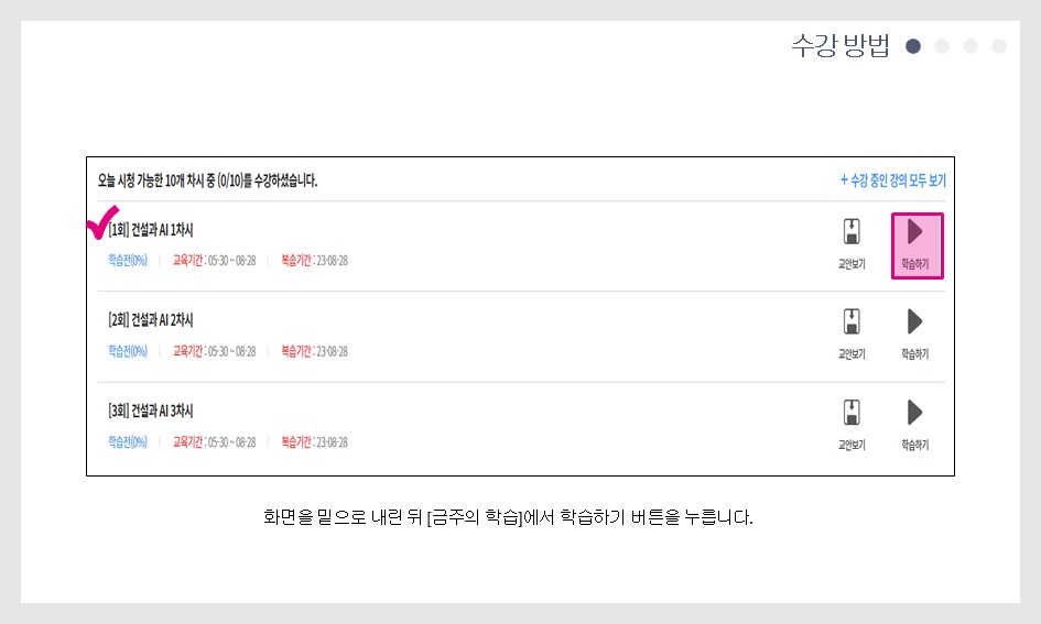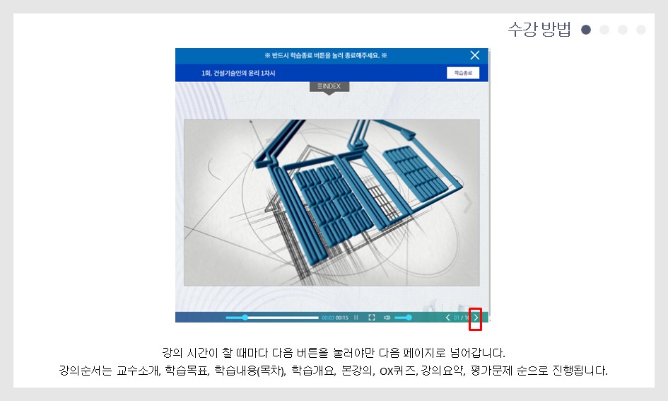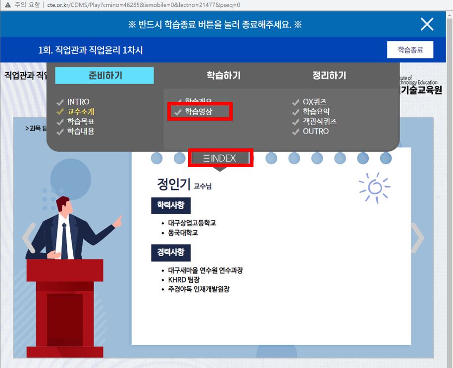 ※ 동영상 시청이 원활하지 않을 경우 아래의 내용을 확인해 보세요. 1. 홈페이지는 크롬(Chrome) 또는 엣지(Edge)로 실행하셔야 원활하게 구동 됩니다. (익스플로러는 지원 중단으로 보안이 취약) 2. 전 회차 학습이 끝나서 다음 회차 강의를 시청하려는데 " 진행 중인 학습회차가 존재...... " 라는 문구가 뜨면서 화면이 꺼지는 경우. 동영상 플레이어 종료 시 학습종료 버튼을 누르지 않아, 발생하는 문제로, 전 회차(어떤 회차가 문제인지 오류내용에 표기됨) 동영상을 다시 들어가서 학습종료 버튼을 누른 후 다시 실제 시청 할 회차를 진행하시면 됩니다. 3. 모바일(휴대폰, 패드)로 동영상을 시청하는데 실행이 잘 안되는 경우. 모바일에서도 크롬 또는 구글로 로그인 및 실행을 하셔야 오류 없이 구동 됩니다. 4. 동영상 시청 중에 다음페이지를 눌렀는데, 마지막 페이지로 넘어가서 "수고하셨습니다" 마지막 페이지가 뜨는 경우. → 일반적으로 인터넷 환경이 좋지 않아서 발생하는 문제 입니다. 단순 동영상(유튜브 등)시청과 다르게 진도율 체크 및 저장 등이 수시로 이루어지므로 서버간 송신이 원활하려면 인터넷 환경 영향이 큽니다. 인터넷환경을 확인해 보시길 바랍니다. → 실제 동영상을 다 시청하지 않았으므로, 진도율은 실제 진도율로 표기되며 다음 회차로 진행이 안 됩니다. → 오류가 발생한 해당 회차를 다시 접속하여 동영상 플레이어 상단에 있는 INDEX를 눌러 → 학습영상(본 강의,6페이지)를 눌러 학습을 다시 진행하시면 됩니다.