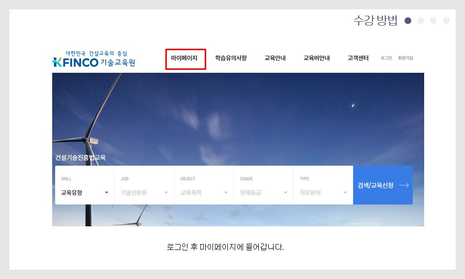 마이페이지 → 증빙서류출력 → 입교통지서 (인쇄) 입교통지서 출력시 신청한 교육과정명, 기술인, 교육목적, 등급 확인이 가능합니다. |